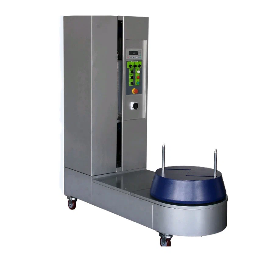 Фактически по принципу работы он является паллетоупаковщиком узкой направленности. В настоящее время такие аппараты нашли широкое применение в аэропортах, так как пассажиры все больше заботятся о безопасности перевозки своего багажа, экономят время, также надежная упаковка позволяет сохранить внешний вид самих чемоданов и сумок. Обмотчики багажа отличаются мобильностью, компактными размерами, удобным управлением. Предварительное растяжение пленки до 200%. Принцип действия такого упаковщика очень прост: оператор устанавливает багаж на платформе, регулирует вертикальные стержни, чтобы обеспечить упаковку в соответствии с размером багажа, вручную протягивает и закрепляет пленку. Багаж упаковывается в 3-5 слоев пленки. После окончания оператор обрезает пленку и убирает упакованный багаж.