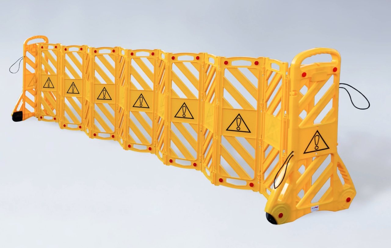 Компактное, устойчивое, раздвижное ограждение из прочного PE материала удобно в перемещении и приводится в рабочее положении в течение нескольких секунд.
